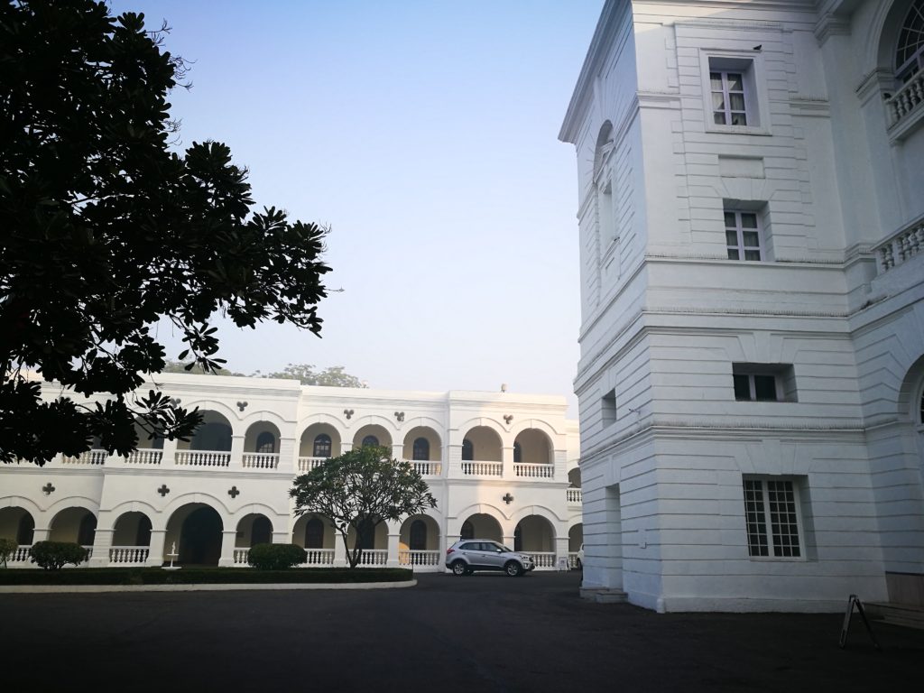 中庭に面したベランダからさらに上の階に上がると、ルーフトップに出ます。朝もやに煙るオールドデリーの街並みが一望できる景色が現れました。