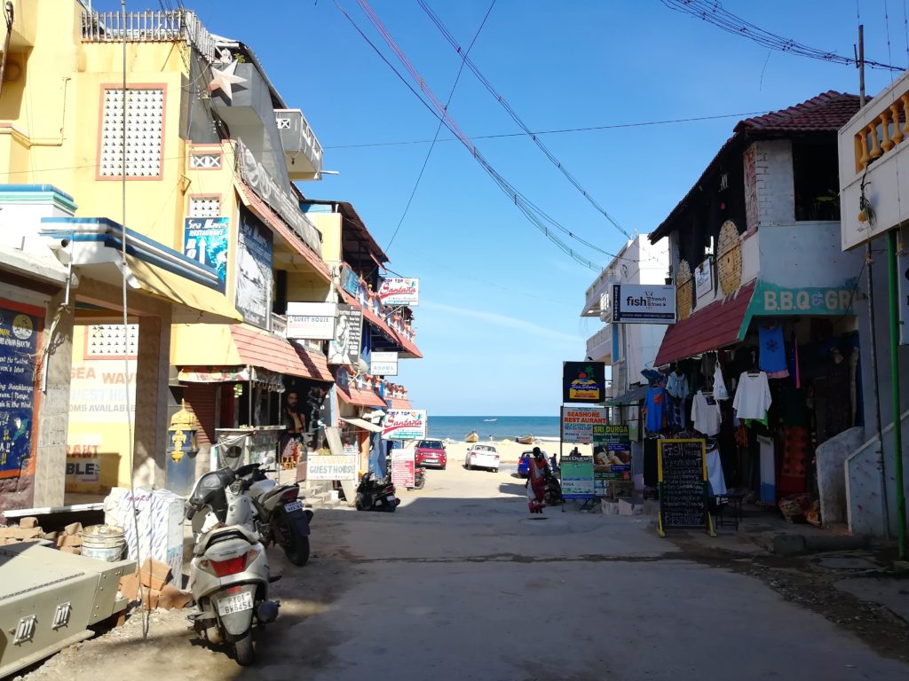チェンナイからマハーバリプラムへは車で2時間程度の距離。海岸沿いの道路を南下し、駐車場で車を降りると、そこからは徒歩で海辺へ向かいます。海までの道路にはお土産やさんなどのお店がずらり。洋服屋、雑貨屋、カフェもあります。