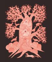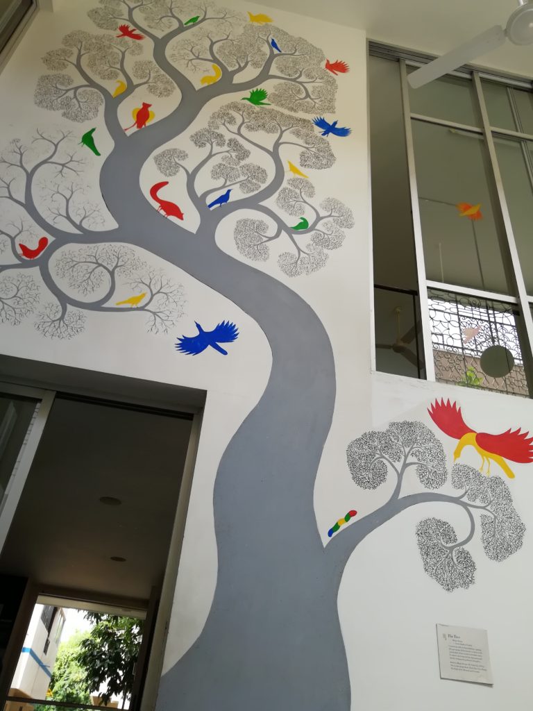 2階まで伸びる吹き抜けの壁に描かれた大木は、タラの代表作「夜の木」の作者バジュさんが、特別に描かれたゴンド画です。見ているだけで心を和ませてくれますね。