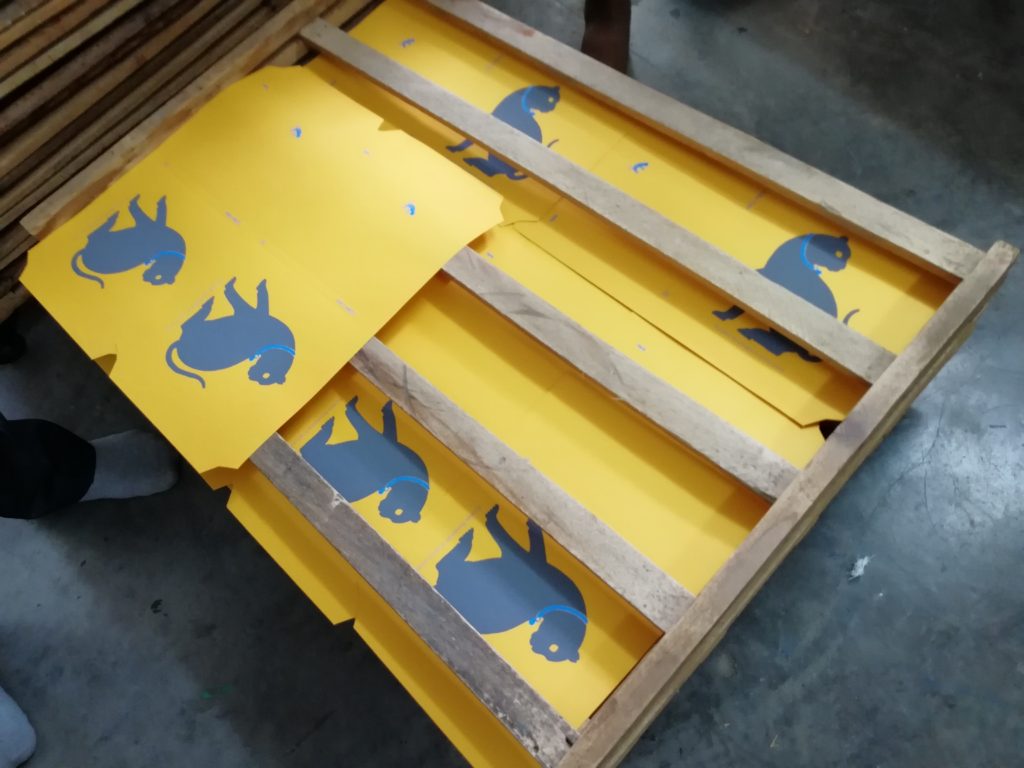 紙を交換する人、刷る人、刷り上がった紙を並べて乾かす人のリレーで、一枚一枚、一色ずつ、色を重ねる作業が黙々と続けられています。