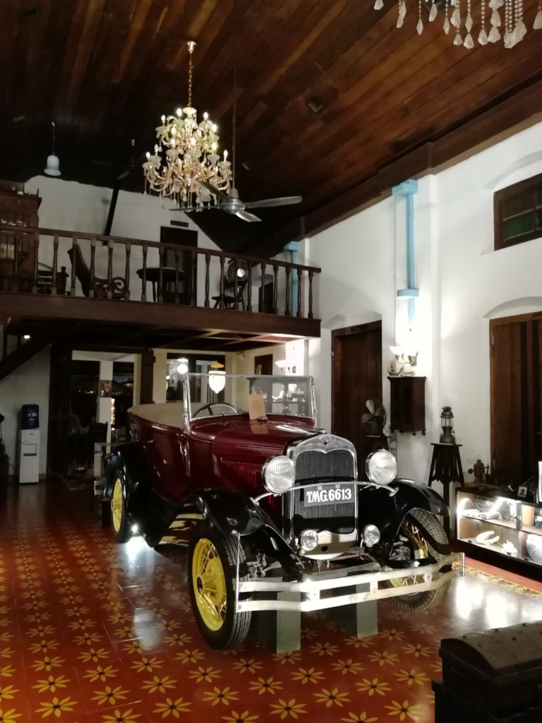 ホール中央に鎮座するクラシックカー、その真上に輝くシャンデリア、隣には王室ご用達メーカーが1790年に制作したグランドピアノが置かれています。